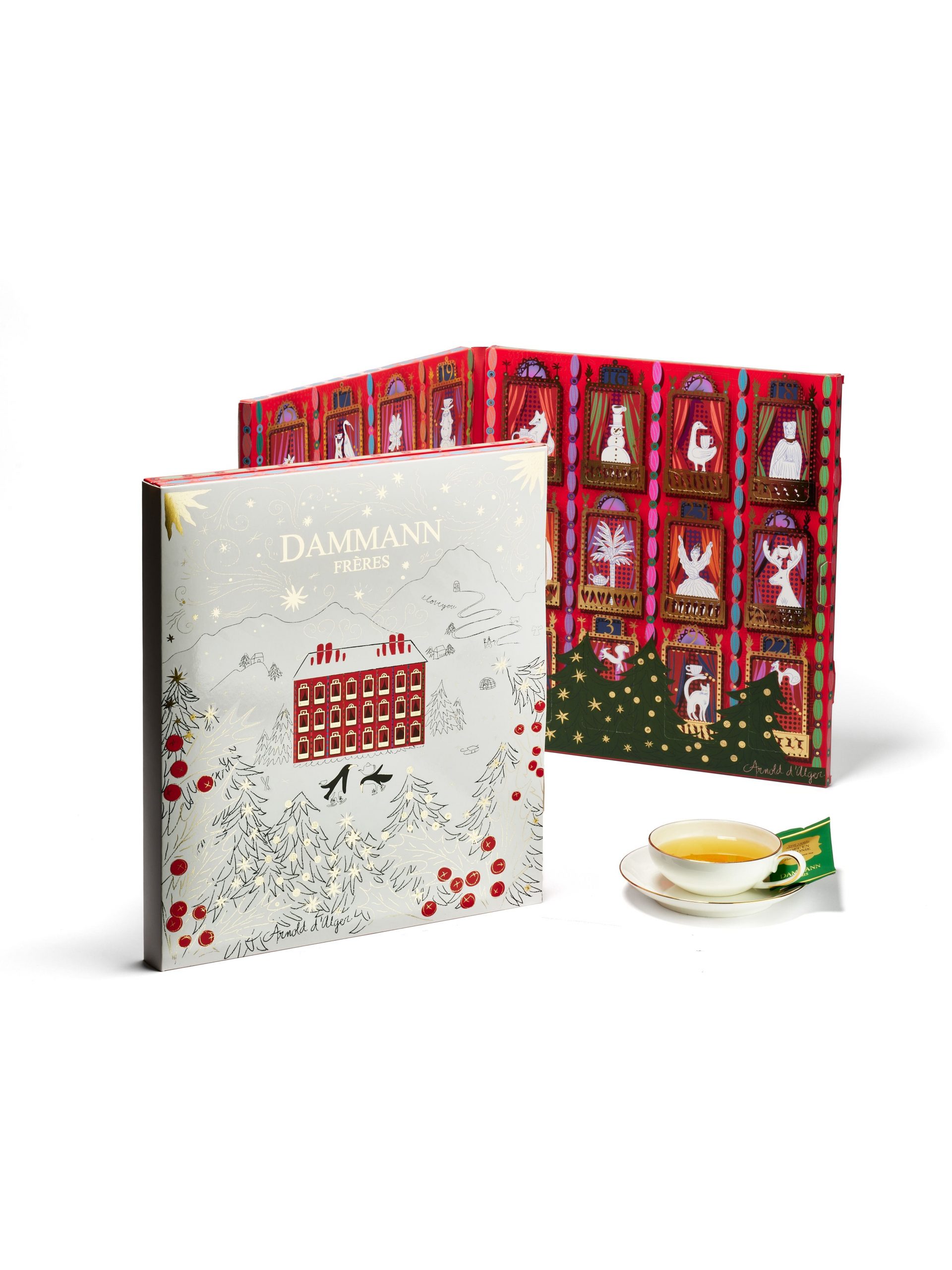 Un calendrier dont le décor évoque un hiver à la montagne et qui nous invite à profiter de la période de l’Avent en savourant des thés et des tisanes sélectionnés pour accompagner vos goûters gourmands. Il rassemble 25 sachets de thé Cristal® pour un assortiment de 24 recettes parfumées ou thés d’origine unique, comprenant certains des mélanges incontournables de Noël de Dammann Frères, mais aussi de nouvelles créations, comme le savoureux et fruité thé vert Noël en Laponie. Ce calendrier de l’Avent a été imaginé en collaboration avec le designer céramiste Arnold d’Alger, créateur du Bazar d’Alger.L’univers joyeux et solaire d’Arnold d’Alger participe grandement à la magie de ce calendrier. En couverture, un paysage de montagne enneigée blanc pur se détache sur un premier plan de forêt de sapins illuminée d’éclats d’or, au centre duquel un hôtel de rêve à la manière des anciens palaces nous invite à découvrir un intérieur coloré qui, en reprenant l’architecture du bâtiment, s’anime à chaque case d’un personnage facétieux.